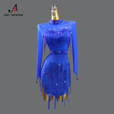 专业蓝色拉丁舞比赛服高级感演出花服黑池规定14岁定制艺考连衣裙