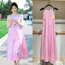 韩国chic夏季法式高级气质名媛丝光缎面长裙收腰显瘦吊带连衣裙女