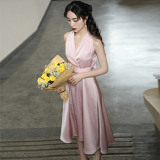JUJU制高级感粉色小礼服法式复古裙V领缎面挂脖连衣裙宴会女气质