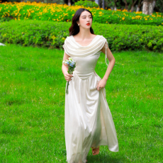 油画女孩白月光复古礼服裙法式宫廷设计感荡领连衣裙高级感小白裙