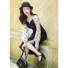 juju定制OL通勤风黑色波点连衣裙早秋新款女装高级感别致开叉裙子