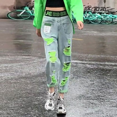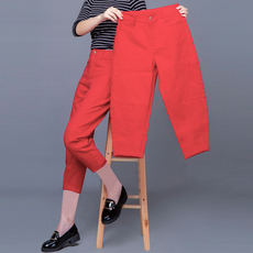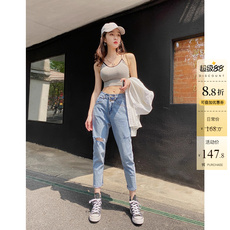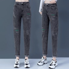 胖mm200斤九分裤高腰哈伦裤加肥加大破洞弹力大码牛仔裤女松紧腰