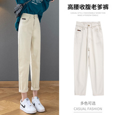 米白色牛仔裤女2025年新款秋季休闲老爹萝卜哈伦裤高腰烟管薄裤子
