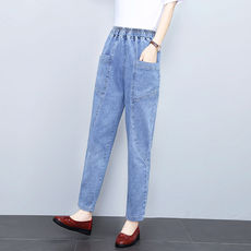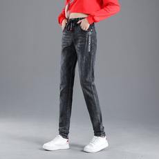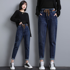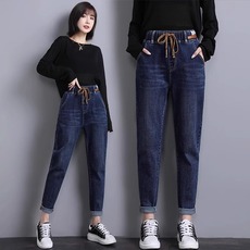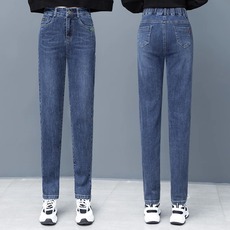 高腰松紧腰牛仔裤女宽松显瘦春秋冬季新款加绒加厚哈伦小脚长裤子