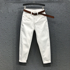 小个子哈伦裤女春秋新款高腰宽松老爹裤大码胖mm九分白色牛仔裤潮