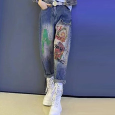 2025春秋新款牛仔裤大码宽松哈伦萝卜印花民族风高腰外穿灯笼裤女