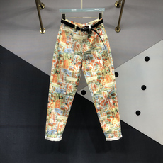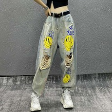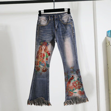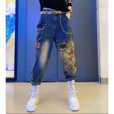 欧货重工个性印花烫钻钉珠大码哈伦牛仔裤女春夏季高腰显瘦老爹裤