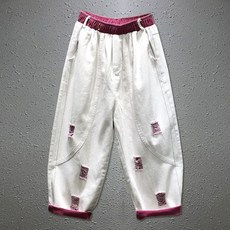 欧洲站春装新款个性彩色破洞高腰宽松阔腿牛仔九分哈伦老爹裤女潮