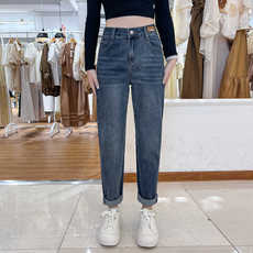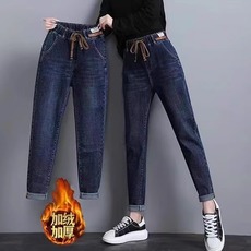 2024秋冬新款牛仔裤女半松紧高腰宽松显瘦哈伦裤抓毛加厚老爹裤子