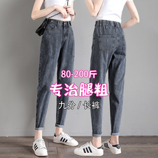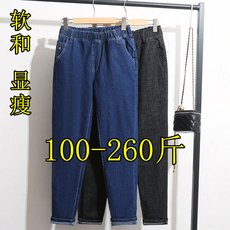 240斤特大码九分阔腿牛仔裤女秋季200胖mm显瘦高腰加肥小脚哈伦裤