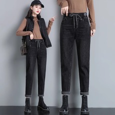 加绒牛仔裤女2025冬季新款松紧腰学生弹力哈伦高腰宽松加厚直筒裤