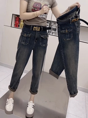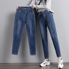 速发新款小个子七分裤松紧高腰宽松牛仔裤大码哈伦八分裤