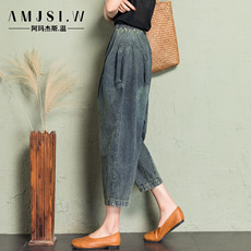 牛仔哈伦裤女八分新款宽松萝卜裤女显瘦高腰老爹裤文艺休闲垮裤