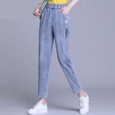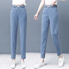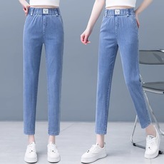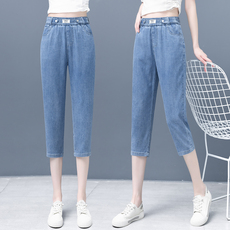 大码天丝高腰牛仔裤女夏季薄款松紧腰显瘦哈伦裤垂感冰丝九分裤子