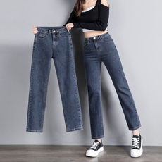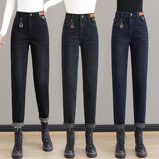 女士牛仔裤女加绒加厚妈妈裤子2024秋冬季新款大码高腰哈伦老爹裤