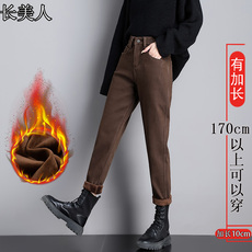 啄木鸟秋冬季加绒加厚复古牛仔裤女新款小个子高腰宽松显瘦哈伦裤