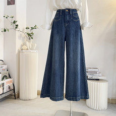 复古蓝色阔腿微喇牛仔裤女2025秋新款弹力高腰显瘦宽松拖地长裤子