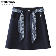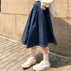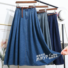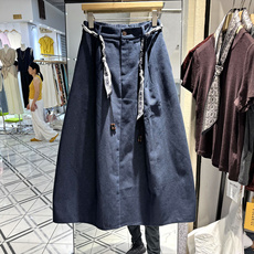 CY 22528 丝巾腰带后松紧高腰复古减龄A字中长牛仔半身裙欧货秋