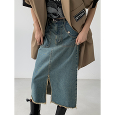 复古牛仔半身裙女春秋2025新款高腰显瘦中长款开叉a字一步包臀裙