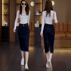 牛仔半身裙女秋装2025新款高腰a字包臀开叉显瘦中长款女士半裙子
