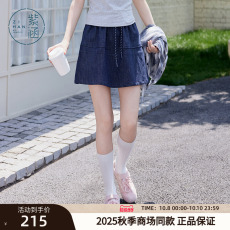 紫涵条纹拼接牛仔a字短裙女2025秋季新款系绳松紧高腰藏青半身裙