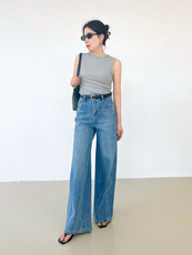 【张凌赫代言】Lee中蓝色水洗428懒懒裤高腰女显瘦宽腿牛仔裤潮流