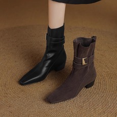 通勤小方头粗跟金属扣短靴女2025秋冬新款复古皮带扣高跟瘦瘦靴潮