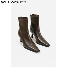 WILLWISHES 王玎设计尖头短靴女细跟弹力瘦瘦靴女显瘦高跟靴#6688
