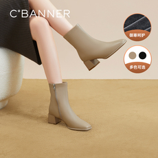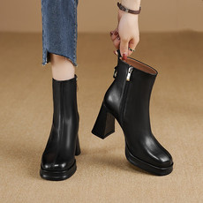 千百度羊皮时装靴百搭气质秋冬高跟短靴子粗跟女鞋瘦瘦靴真皮加绒