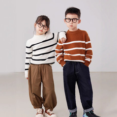 跨境半高领毛衣女半女加厚男童条纹2025秋冬新款儿童童装针织衫