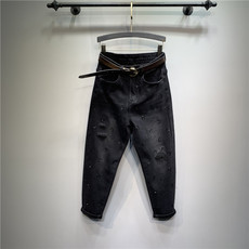 大码高腰黑色九分小脚牛仔裤女微胖mm梨型身材遮胯显瘦弹力哈伦裤