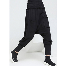 驿墅新款大码女式休闲裤松紧腰纯黑色9分裤紧口小脚哈伦裤垮裤女