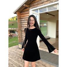 pusumede黑色丝绒连衣裙女新款设计感气质复古长袖小黑裙收腰短裙