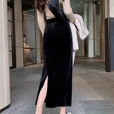 秋冬季真丝女丝绒厚款黑色气质桑蚕丝时尚开叉中长优雅包臀半身裙