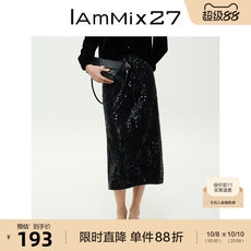 IAmMIX27黑色丝绒半身裙女松紧腰法式显瘦亮片绣后开叉直筒裙长裙