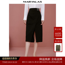 曼德诗黑色开叉半身裙2025秋季新款气质设计感七分裙百搭一步裙女