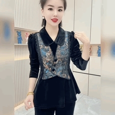 复古V领长袖金丝绒衬衫女秋冬新款木耳边拼接打底衫时尚黑色上衣t