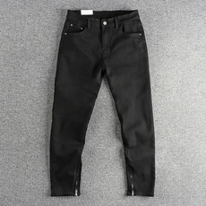 拉链裤脚设计美式高街复古潮流黑色牛仔裤男 修身小脚百搭九分裤