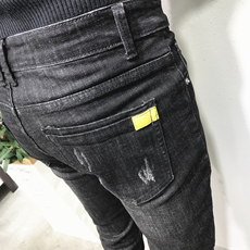 春秋潮牌男士黑色修身窄脚牛仔裤男破洞补丁个性青年九分小脚裤