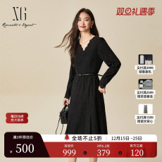 法式千金风蕾丝拼接收腰V领连衣裙女长款黑色年会礼服裙秋冬21882