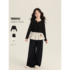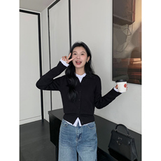 韩版假两件针织开衫女早秋大码高级感黑色v领打底衫时髦短款上衣
