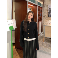NEVA HU黑色长袖针织开衫女春秋毛织外套复古圆领气质短款上衣