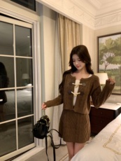 辰米范 黑色连帽针织开衫女修身短款毛衣两件套+包臀半身裙套装