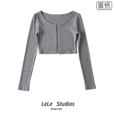 【包邮】甜辣设计感钉子扣坑条长袖针织衫女黑色短款紧身毛衣开衫