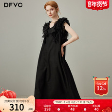 dfvc黑色亚麻气质V领背心裙女2025年夏季新款木耳无袖连衣裙长裙