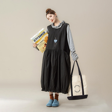 黑色韩系氛围感圆领夹棉背心连衣裙女冬季新款宽松设计感工装长裙