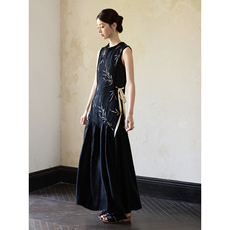 金丝绒碎花黑色无袖连衣裙两件套女秋冬2025新款法式优雅背心长裙