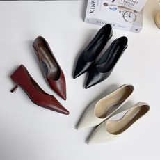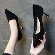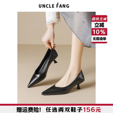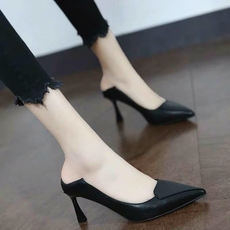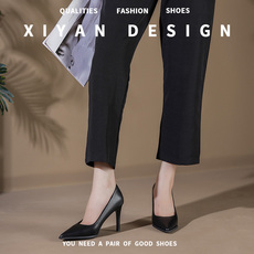 真皮高跟单鞋女尖头细跟面试鞋2023春款通勤黑色中跟职业工作鞋子