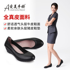 酒店工作鞋女黑色鞋子平底上班女鞋舒适坡跟单鞋OL小码中跟空姐鞋