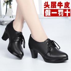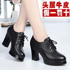 春秋单鞋工作鞋女鞋子黑色真皮中跟粗跟系带皮鞋防水台高跟鞋大码